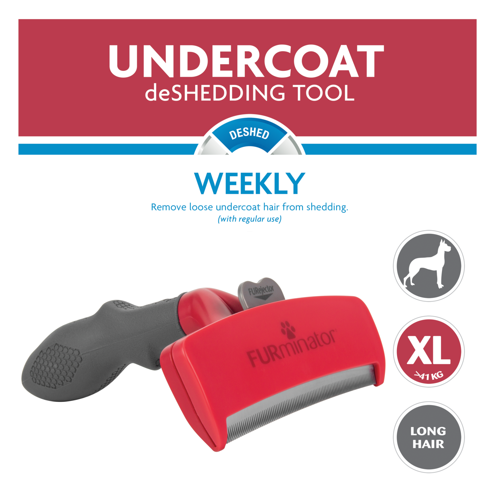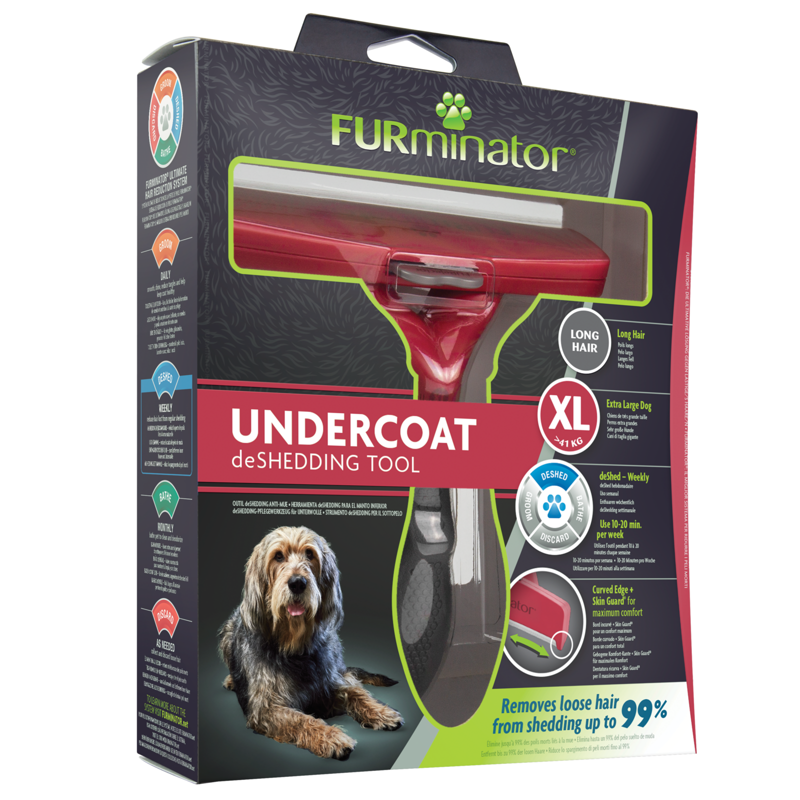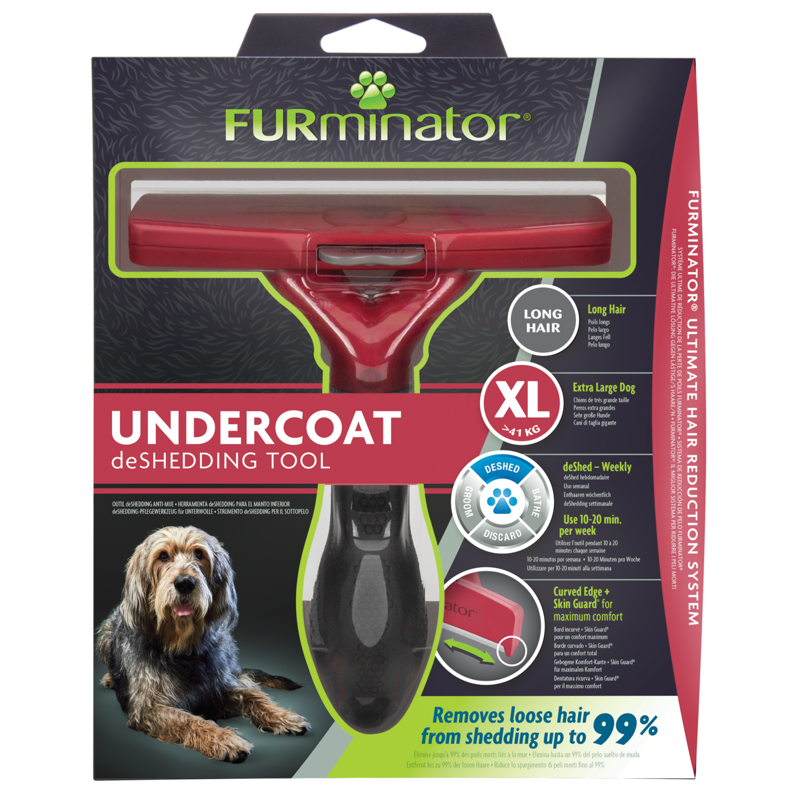 Narzędzie zaprojektowane specjalnie dla psów o masie ciała powyżej 42 kg o sierści dłuższej niż 5 cm. Pozwala skutecznie usuwać podszerstek i martwy włos, redukując linienie do 99%. Osłonięte krawędzie zapobiegają podrażnianiu skóry.
