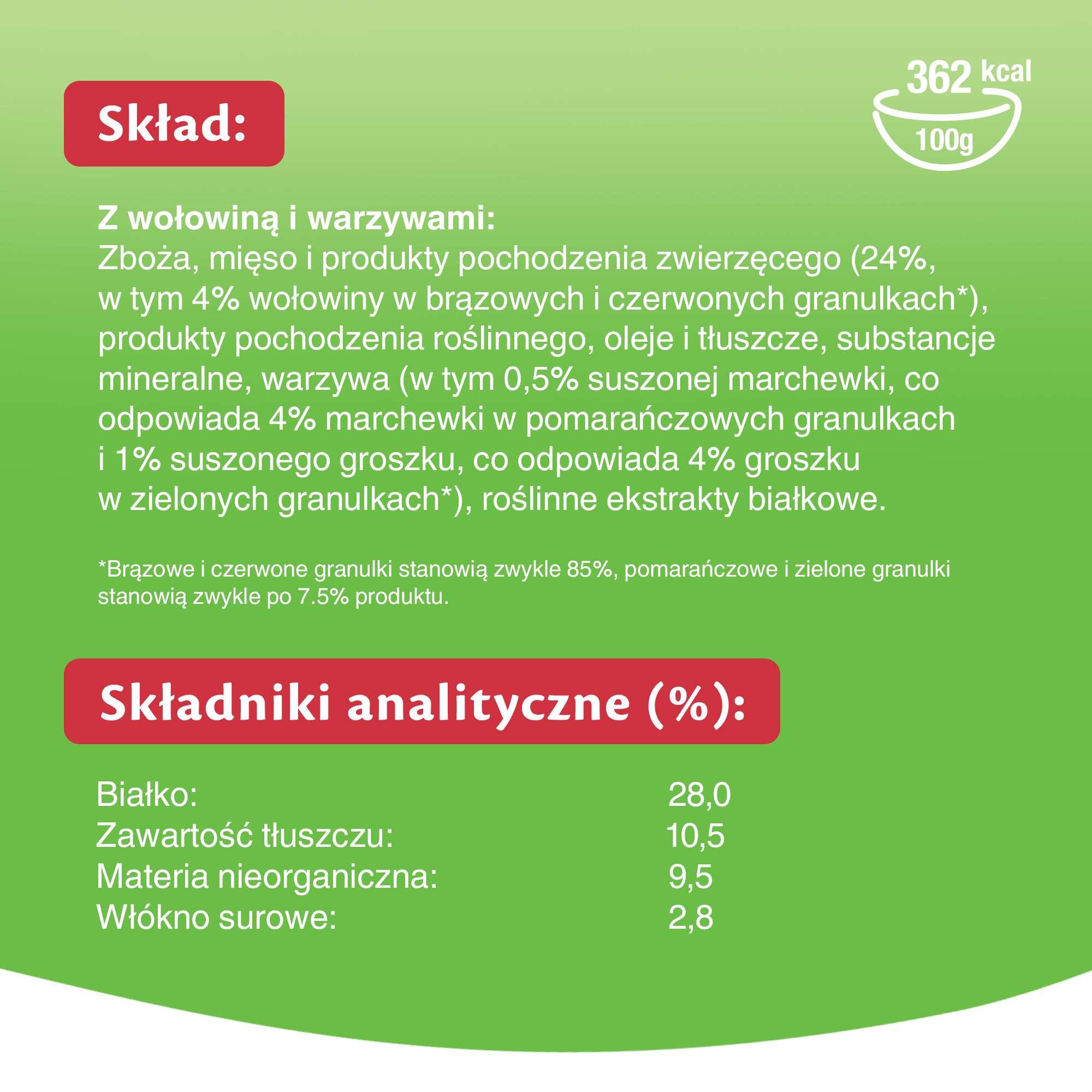 Zboże, mięso i produkty pochodzenia zwierzęcego (24%, w tym 4% wołowiny w brązowych i czerwonych granulkach*), produkty pochodzenia roślinnego, oleje i tłuszcze, substancje mineralne, warzywa (w tym 0,5% suszonej marchewki, co odpowiada 4% marchewki w pomarańczowych granulkach i 1% suszonego groszku, co odpowiada 4% groszku w zielonych granulkach*), roślinne ekstrakty białkowe.