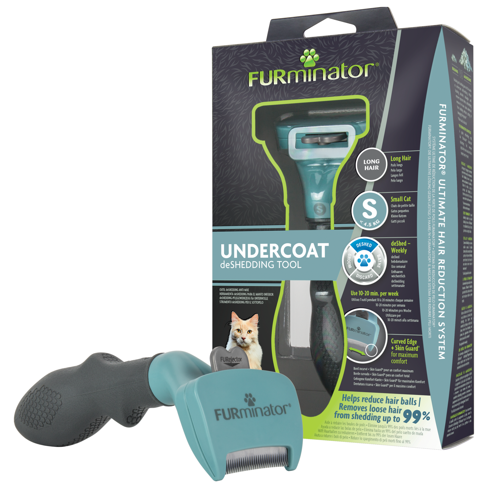 Narzędzie FURminator® do usuwania podszerstka dla długowłosych małych kotów (S). Narzędzie zaprojektowane specjalnie dla kotów o masie ciała poniżej 4,5 kg o sierści dłuższej niż 5 cm. Produkt został zaprojektowany w celu promowania zdrowej skóry i sierści u zwierząt domowych oraz znacznego zmniejszenia ilości włosów, które każdego dnia zwierzę gubi i roznosi po domu. Pozwala skutecznie usuwać podszerstek i martwy włos, redukując linienie do 99%. Osłonięte krawędzie zapobiegają podrażnianiu skóry i chronią urządzenie podczas jego przechowywania dzięki technologii Edge Guard. Łatwy w obsłudze. Intuicyjne czyszczenie.