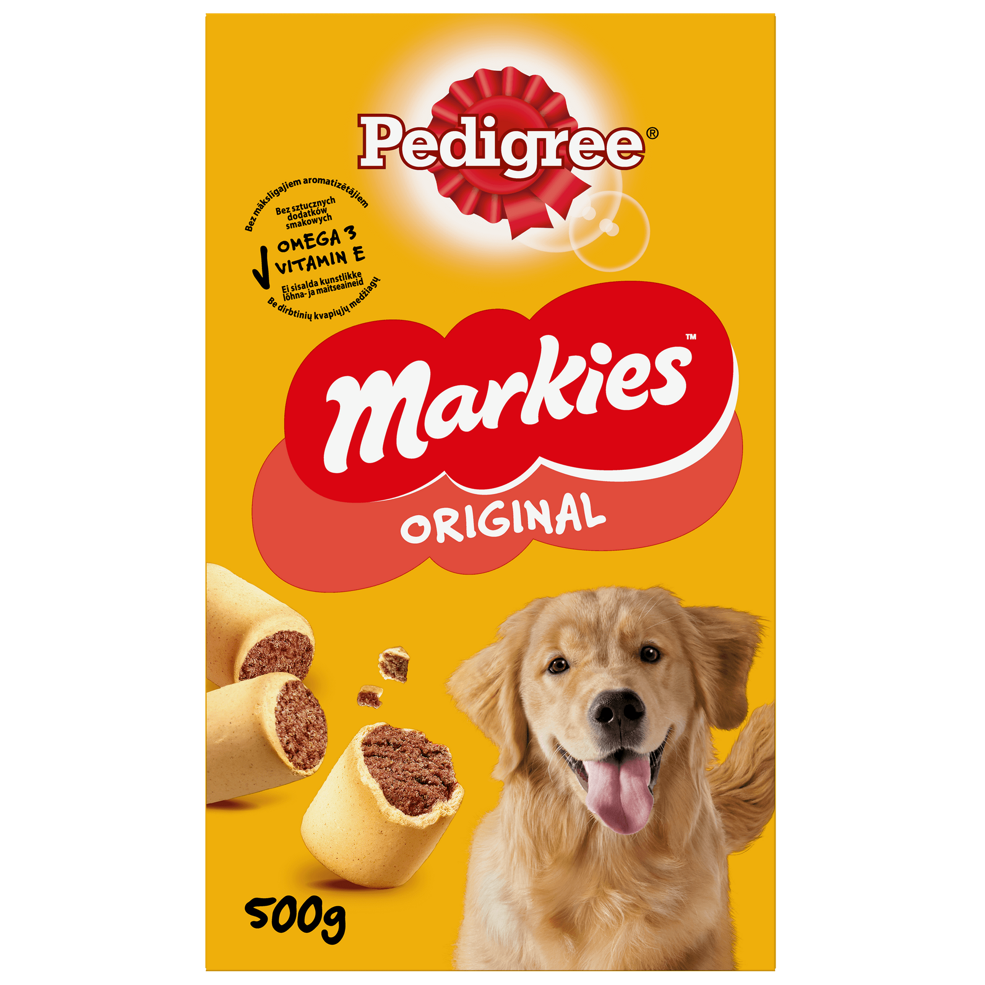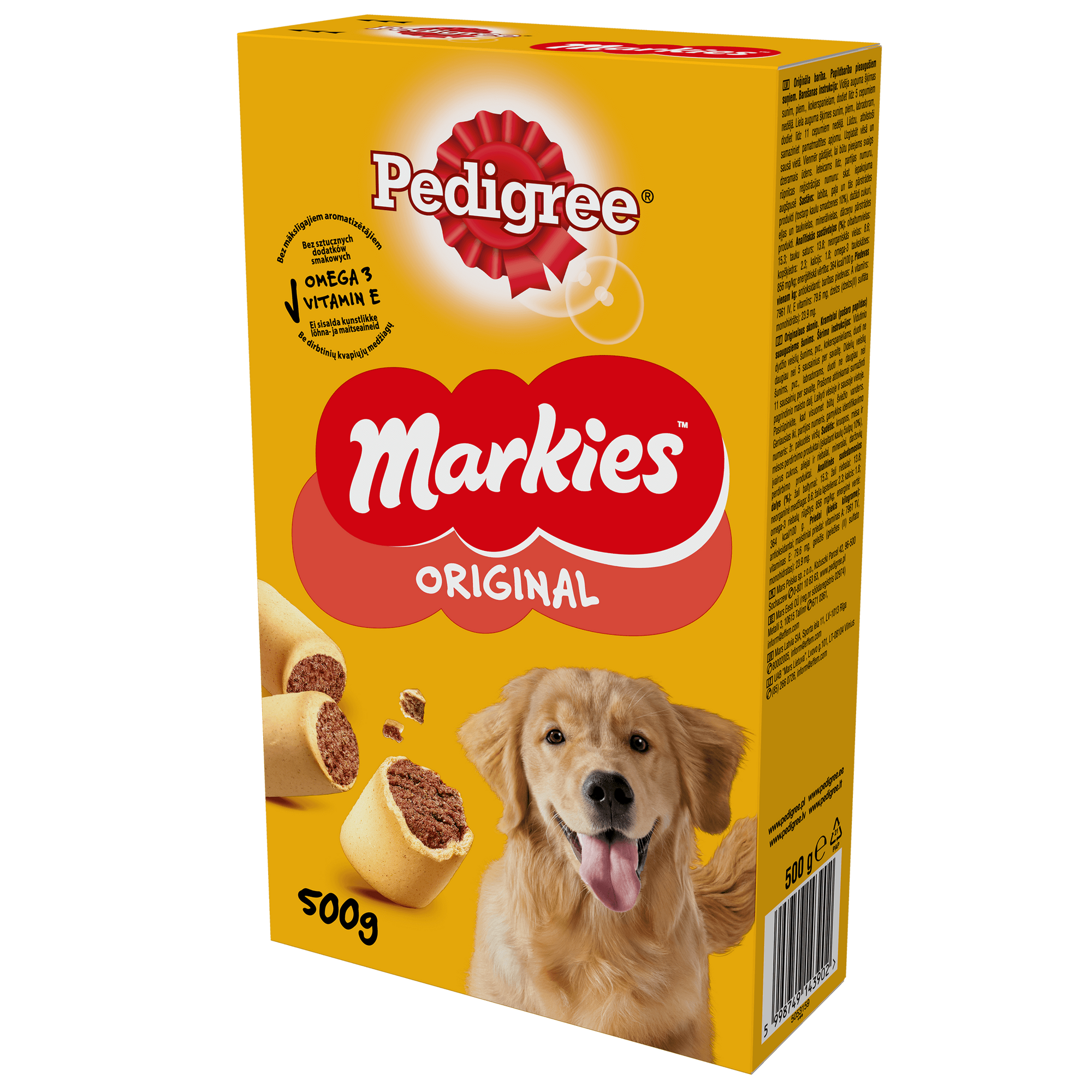 PEDIGREE® Markies Original są wyśmienitymi ciasteczkami, dzięki którym nie tylko sprawisz swojemu pupilowi przyjemność, ale też zadbasz o jego zdrowie i witalność. Zawarty w składzie wapń wspiera utrzymanie zdrowych kości i zębów, a dodatek witaminy E działa pozytywnie na układ odpornościowy. Przysmak zawiera także kwasy Omega-3, które pomagają utrzymać Twojego pupila w dobrej formie przez całe życie. Ciasteczka mają formę kruchych rurek z dodatkiem kości szpikowej, której smak psy uwielbiają.