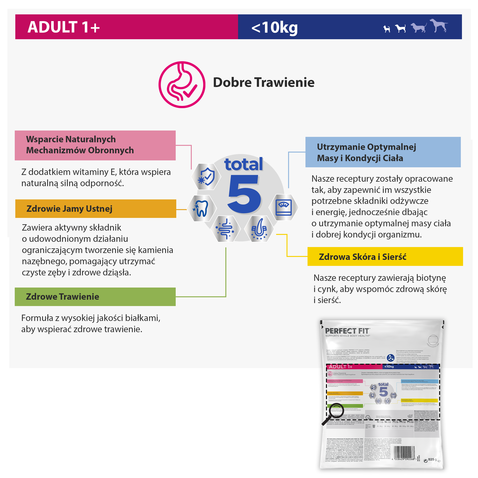 Pyszny pokarm Perfect Fit™ Adult 1+ bogaty w kurczaka zawiera wyjątkową formułę Total 5, która wspiera 5 najważniejszych obszarów zdrowia dorosłego pupila: wspomaga silny układ odpornościowy, zdrowie jamy ustnej, zdrowe trawienie, zdrową skórę i sierść oraz utrzymanie optymalnej kondycji i masy ciała. Receptura Perfect Fit™ Adult 1+ została opracowana we współpracy z lekarzami weterynarii oraz specjalistami ds. żywienia z Instytutu Nauki o Zwierzętach WALTHAM™, aby dostarczyć niezbędne składniki odżywcze dorosłym psom. Tak jak inne warianty, również pokarm Perfect Fit™ Adult 1+ bogaty w kurczaka dostarcza dodatkowe korzyści: wspomaga dobre trawienie dzięki optymalnej mieszance włókien pokarmowych oraz zawiera prebiotyki, aby dbać o mikrobiom jelitowy. Wybierając to pożywienie dla swojego pupila małej rasy, masz pewność, że unikalna formuła Perfect Fit™ wspiera zdrowie całego organizmu Twojego psa oraz zapewnia mu dodatkowe korzyści zdrowotne, które są specjalnie dopasowane do jego wieku i indywidulanych wymagań.