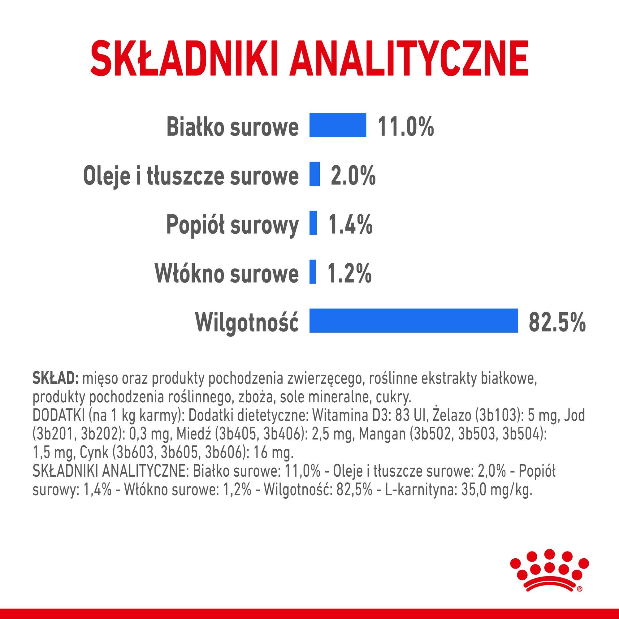 Składniki analityczne: Białko surowe: 11,0% - Oleje i tłuszcze surowe: 2,0% - Popiół surowy: 1,4% - Włókno surowe: 1,2% - Wilgotność: 82,5% - L-karnityna: 35,0 mg/kg.
